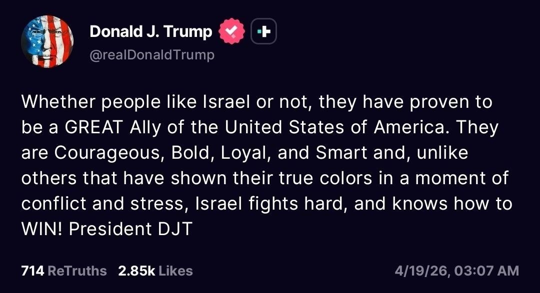 «Нравится ли вам Израиль или нет, но он доказал, что является великолепным союзником Соединенных Штатов Америки. Они [израильтяне] — мужественные, смелые, верные и умные, и, в отличие от других, показавших свое истинное лицо во время конфликта и напряженности, Израиль сражается до последнего и знает, как побеждать!», — написал лидер США в Truth Social.