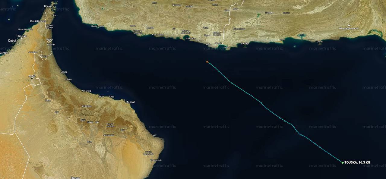 Согласно сообщениям, иранское контейнеровозное судно Touska было перехвачено примерно в 50 км от побережья Ирана при попытке войти в Оманский залив.