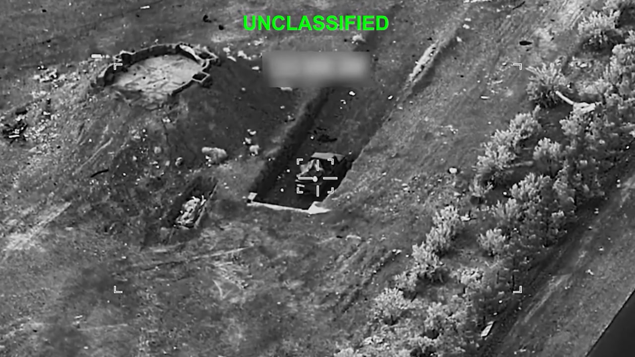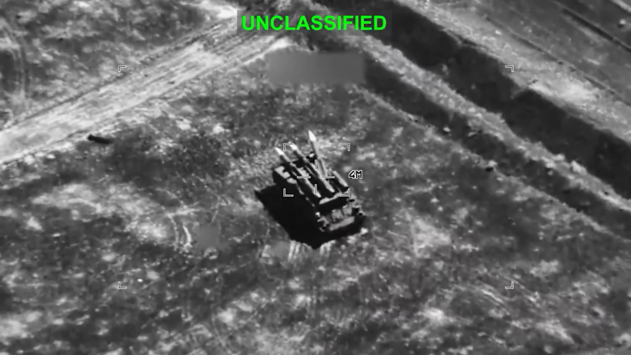 Уничтожение ударом ВВС США иранского БПЛА Shahed 171 (или Shahed 191), пусковой установки 2П25 из состава ЗРК 2К12 «Куб» с отвалившейся ЗУР и пикапа, припаркованного возле пустой позиции для зенитки.