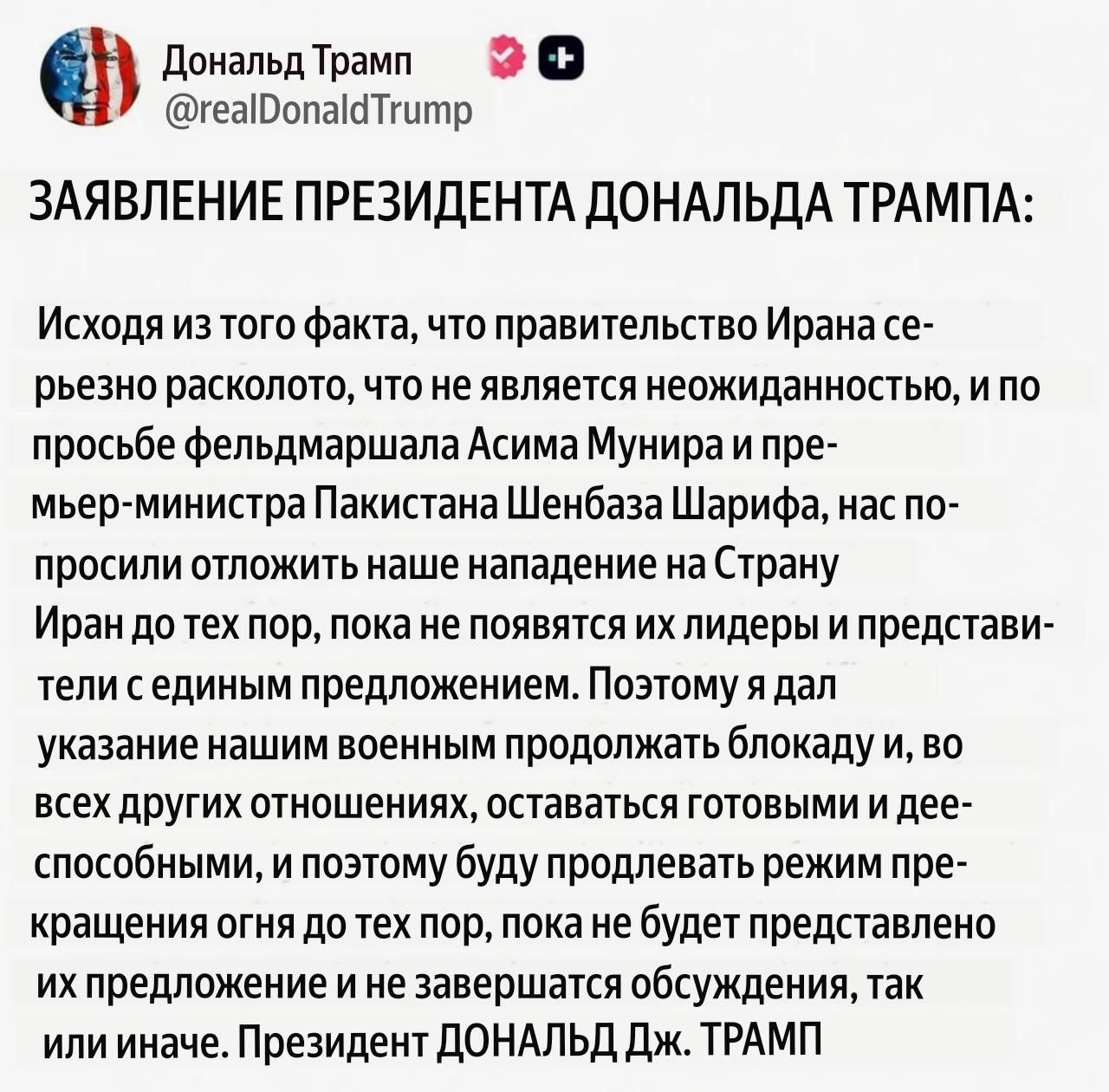 «От себя лично и от имени [командующего ВС Пакистана] фельдмаршала Асима Мунира я искренне благодарю президента Трампа за то, что он любезно принял нашу просьбу о продлении режима прекращения огня, чтобы позволить дипломатическим усилиям идти своим чередом. С учетом оказанного доверия, Пакистан продолжит прикладывать все свои усилия по урегулированию конфликта путем переговоров. Я искренне надеюсь, что обе стороны продолжат соблюдать режим прекращения огня и смогут заключить всеобъемлющее «мирное соглашение» во время второго раунда переговоров, запланированного в Исламабаде, чтобы окончательно прекратить конфликт», — написал он в X.