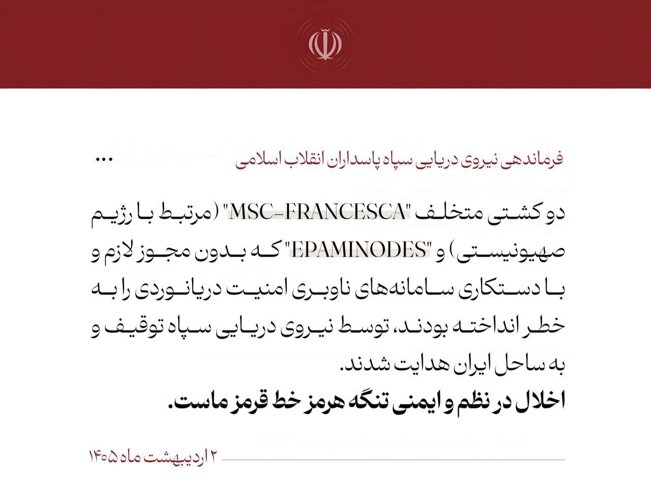 ВМС КСИР сообщили о захвате двух контейнеровозов — MSC FRANCESCA под флагом Панамы и EPAMINONDAS под флагом Либерии, пытавшихся нарушить блокаду Ормузского пролива.