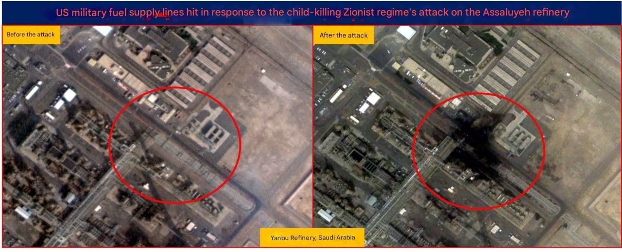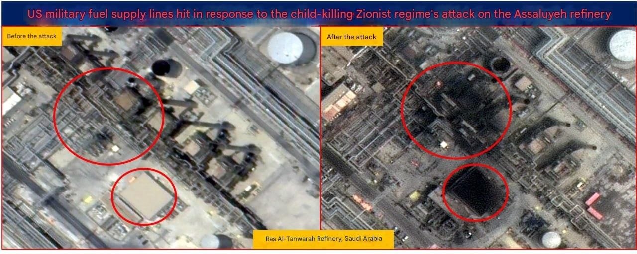 КСИР опубликовал спутниковые снимки ущерба, нанесённого нефтеперерабатывающим заводам ARAMCO в Рас-Тануре и Янбу в Саудовской Аравии.