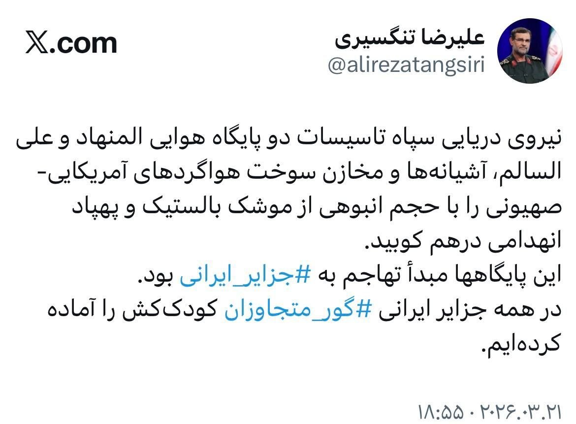 Военно-морские силы КСИР нанесли массированный удар баллистическими ракетами и ударными беспилотниками по объектам двух авиабаз Аль-Минхад (Дубай) и Али аль-Салем (Кувейт), уничтожив ангары и топливные хранилища американско-сионистской авиации.