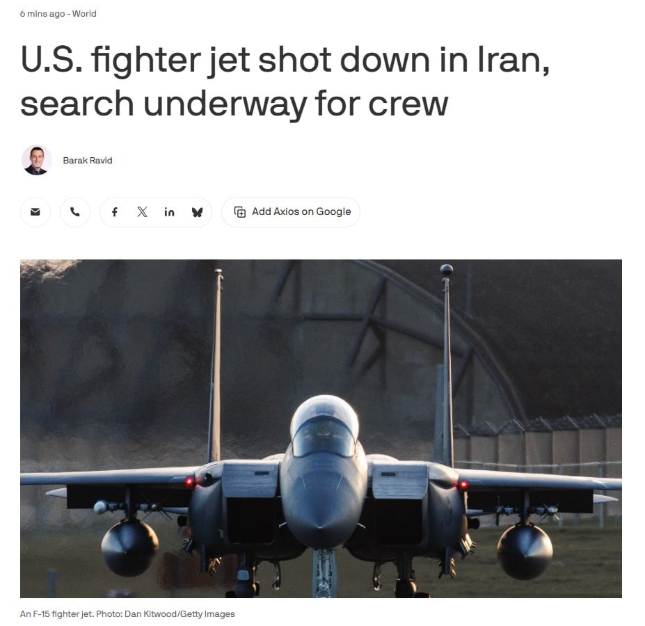Издание Axios подтверждает потерю F-15E ВВС США над Ираном и проведение спасательной операции по поиску сбитых летчиков. Аналогичное также пишут израильские каналы Channel 12 и Channel 14.