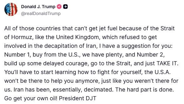 «Все те страны, которые не могут получить авиационное топливо из-за Ормузского пролива, такие как Великобритания, которая отказалась участвовать в обезглавливании Ирана, у меня есть предложение для вас: Во-первых, покупайте у США, у нас его много, а во-вторых, соберитесь с духом, отправляйтесь в пролив и просто ЗАБЕРИТЕ ЕГО.