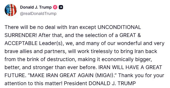 «С Ираном не будет никакой сделки, помимо безоговорочной капитуляции», — написал американский лидер в Truth Social.