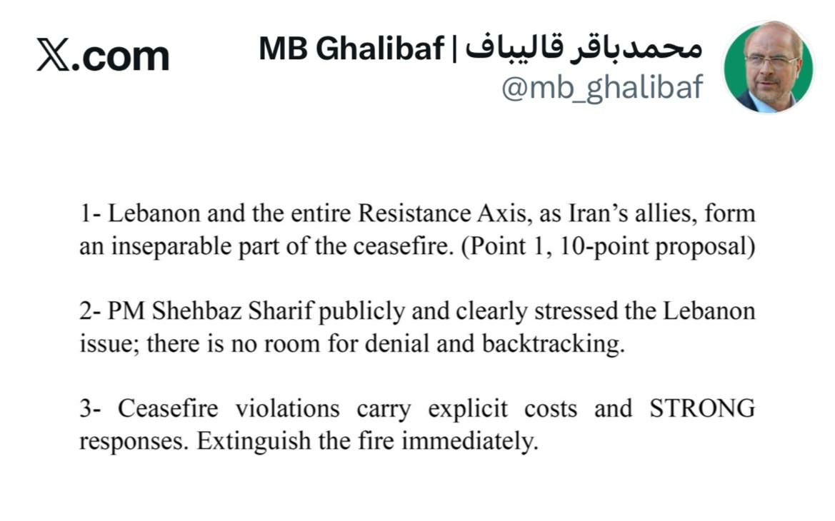 - Ливан и весь фронт сопротивления как союзники Ирана являются неотъемлемой частью режима прекращения огня (пункт 1 десятипунктного плана).