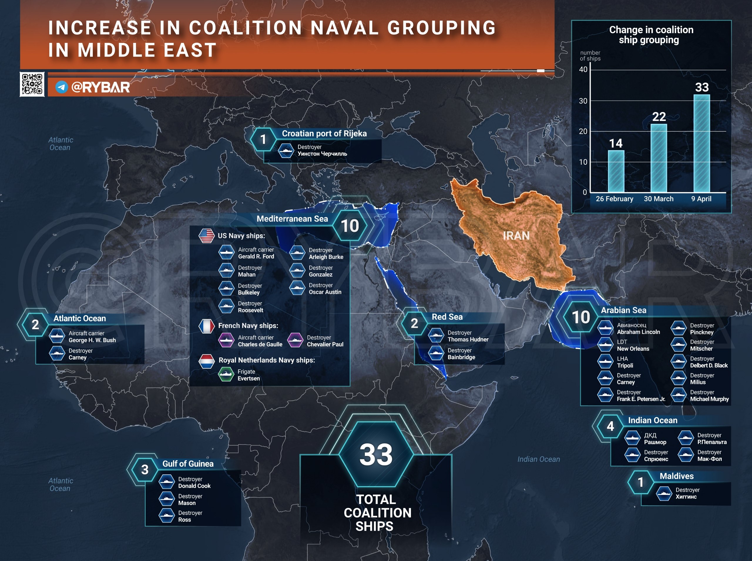 Текущий состав и численность авиационной группировки (https://t.me/rybar/79376) ВС США и корабельной группировки (https://t.me/rybar/79374) коалиции в Ближневосточном регионе.
