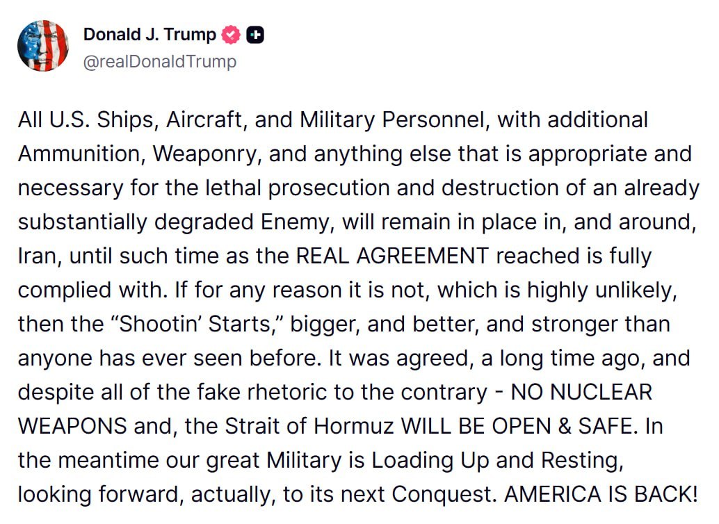 Трамп потребовал, чтобы Иран начал соблюдать «настоящее» соглашение о прекращении огня, иначе «начнётся стрельба», добавив, что американские военные «перезагружаются и отдыхают, фактически, с нетерпением ожидая своей следующей победы».