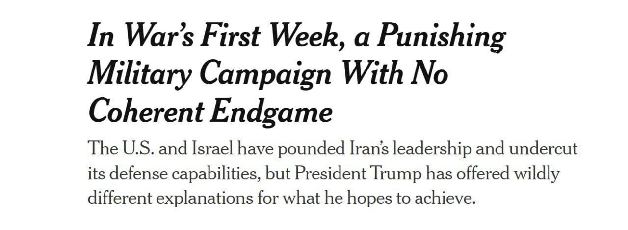 New York Times: война против Ирана за первую неделю обошлась США примерно в 6 миллиардов долларов, из которых почти 4 миллиарда были потрачены на боеприпасы, в основном на ракетные перехватчики.