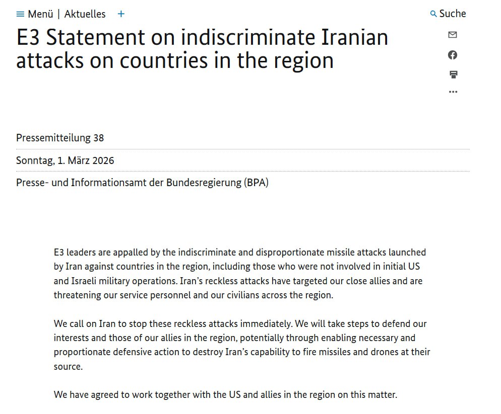 «Наш президент провел телефонный разговор с председателем Европейской комиссии Урсулой фон дер Ляйен. Обсуждались нападение на Иран и последовавшая за ними эскалация. Эрдоган заявил, что Турция приглашает все стороны вернуться к дипломатии и переговорам и готова оказать всестороннюю поддержку мирному процессу», — говорится в заявлении канцелярии турецкого лидера по итогам разговора.