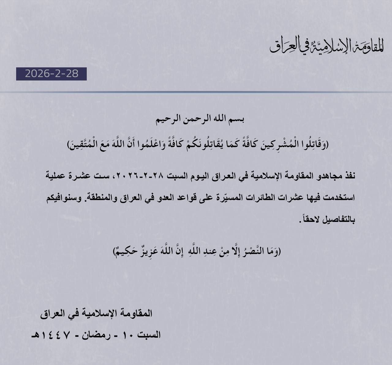 Исламское сопротивление Ирака в официальном заявлении сообщило, что было проведено 16 операций против вражеских баз в Ираке и регионе с использованием десятков беспилотников.