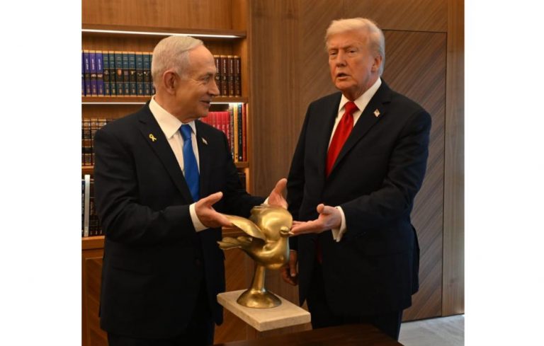Премьер-министр Израиля Биньямин Нетаньяху во время встречи подарил президенту США Дональду Трампу золотую статуэтку голубя, символизирующего мир. Нетаньяху разместил совместные снимки с Трампом в X.
