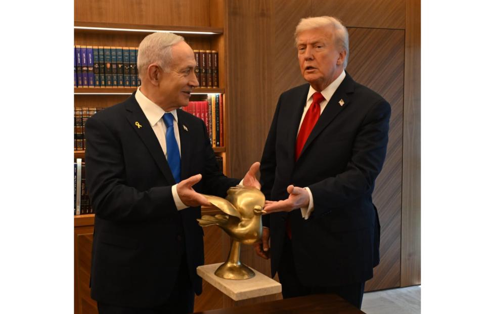 Премьер-министр Израиля Биньямин Нетаньяху во время встречи подарил президенту США Дональду Трампу золотую статуэтку голубя, символизирующего мир. Нетаньяху разместил совместные снимки с Трампом в X.