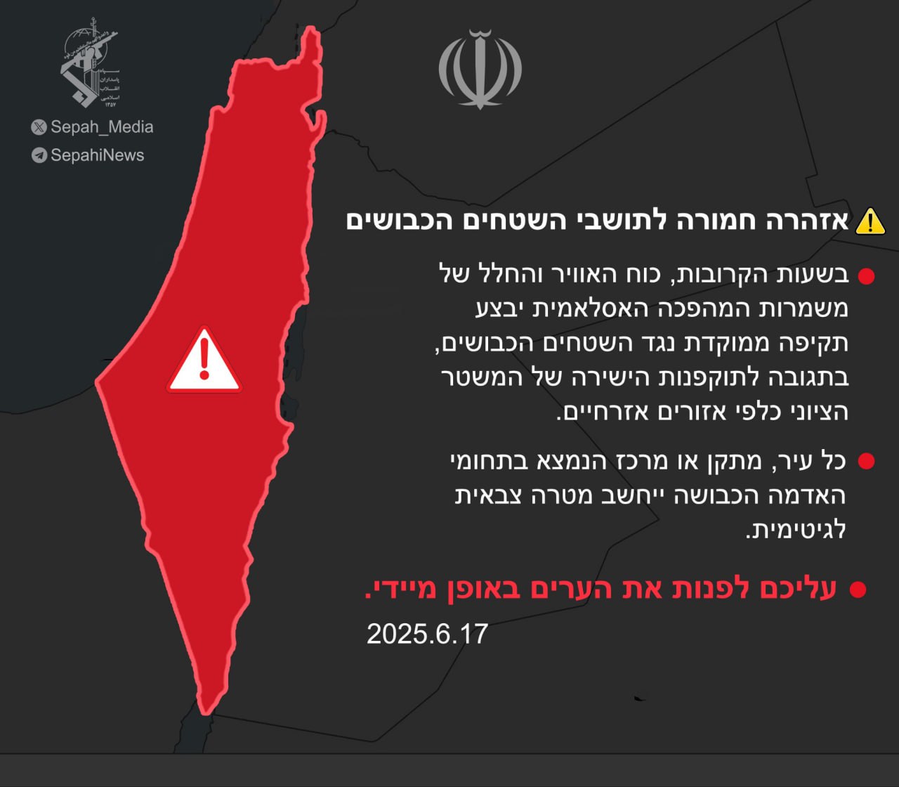 Израильский министр обороны Исраэль Кац после новых ночных обстрелов со стороны Ирана, приведших к жертвам среди гражданского населения, пригрозил, что жители Тегерана «скоро заплатят цену» за действия властей исламской республики.
