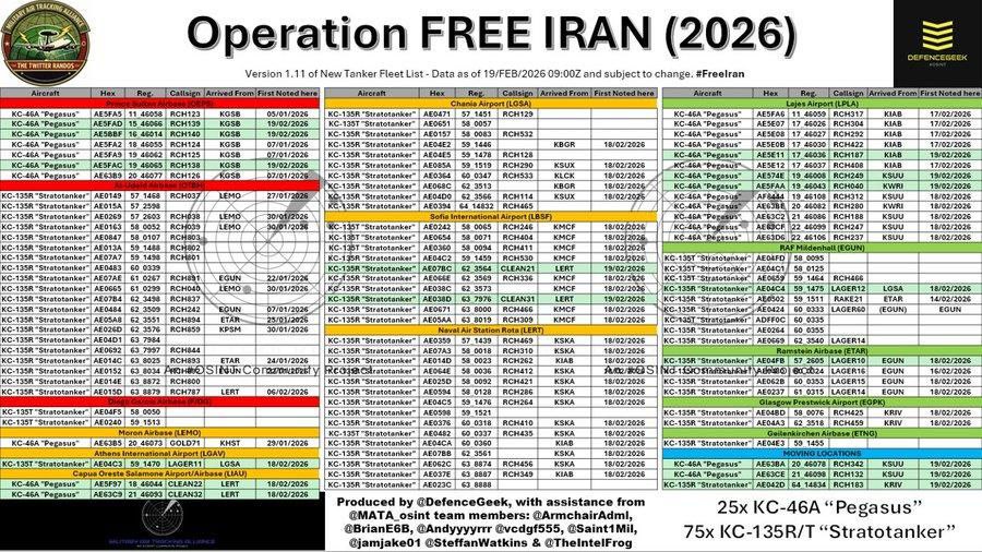 Порядка сотни американских военных самолётов-топливозаправщиков размещены или находятся в пути для поддержки возможных боевых операций против Ирана.