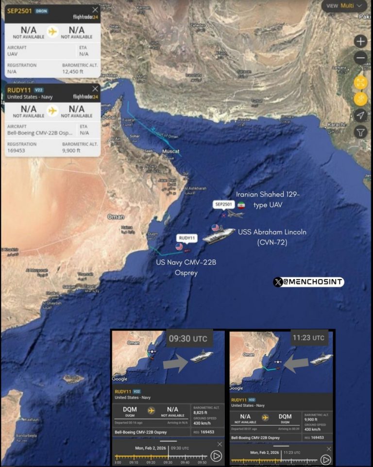 Было зафиксировано, что ранее в понедельник из данного района в Оман совершил полет транспортный конвертоплан CMV-22B Osprey, постоянно базирующийся на авианосце.