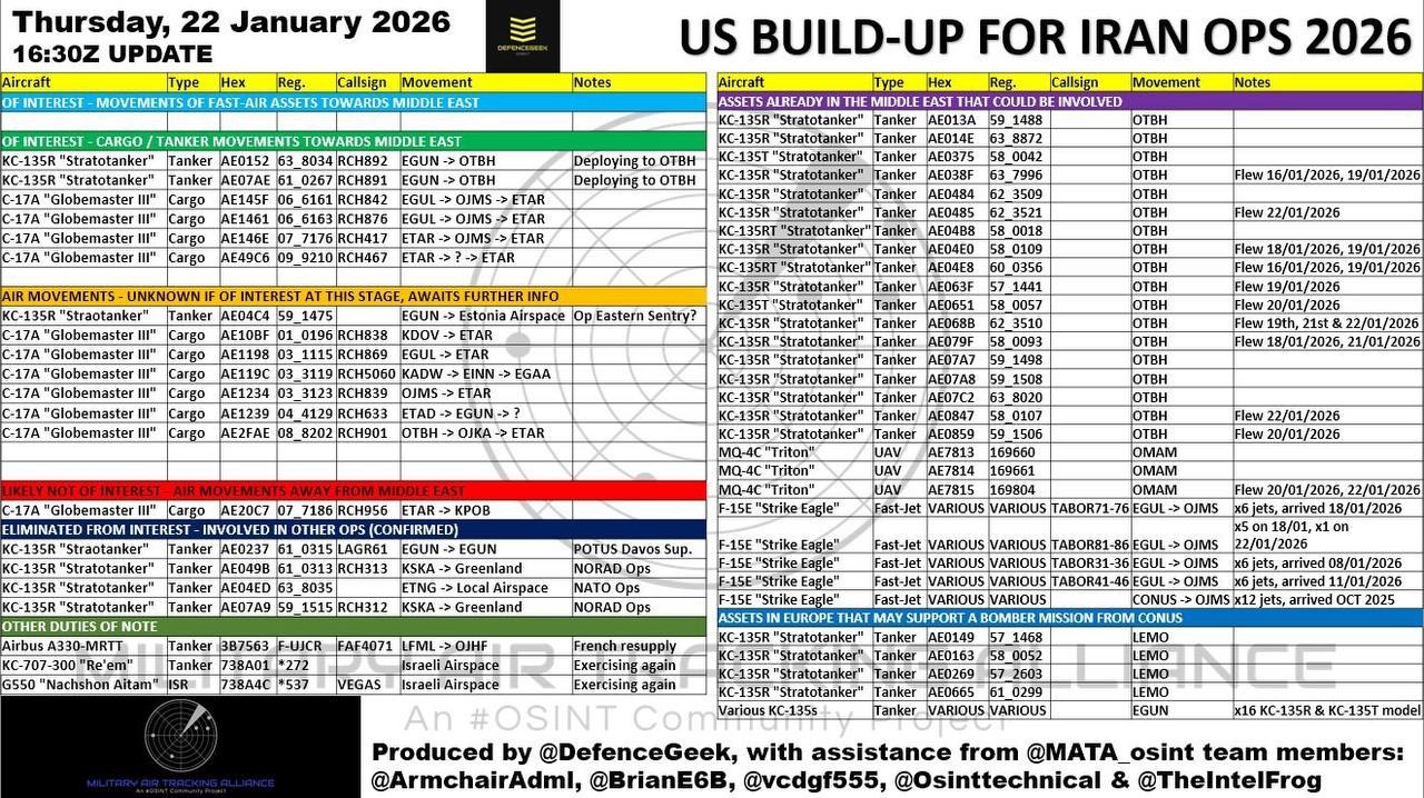 Данные OSINT касательно переброски военной авиации США и союзников на Ближний Восток, вероятно, для операции против Ирана.