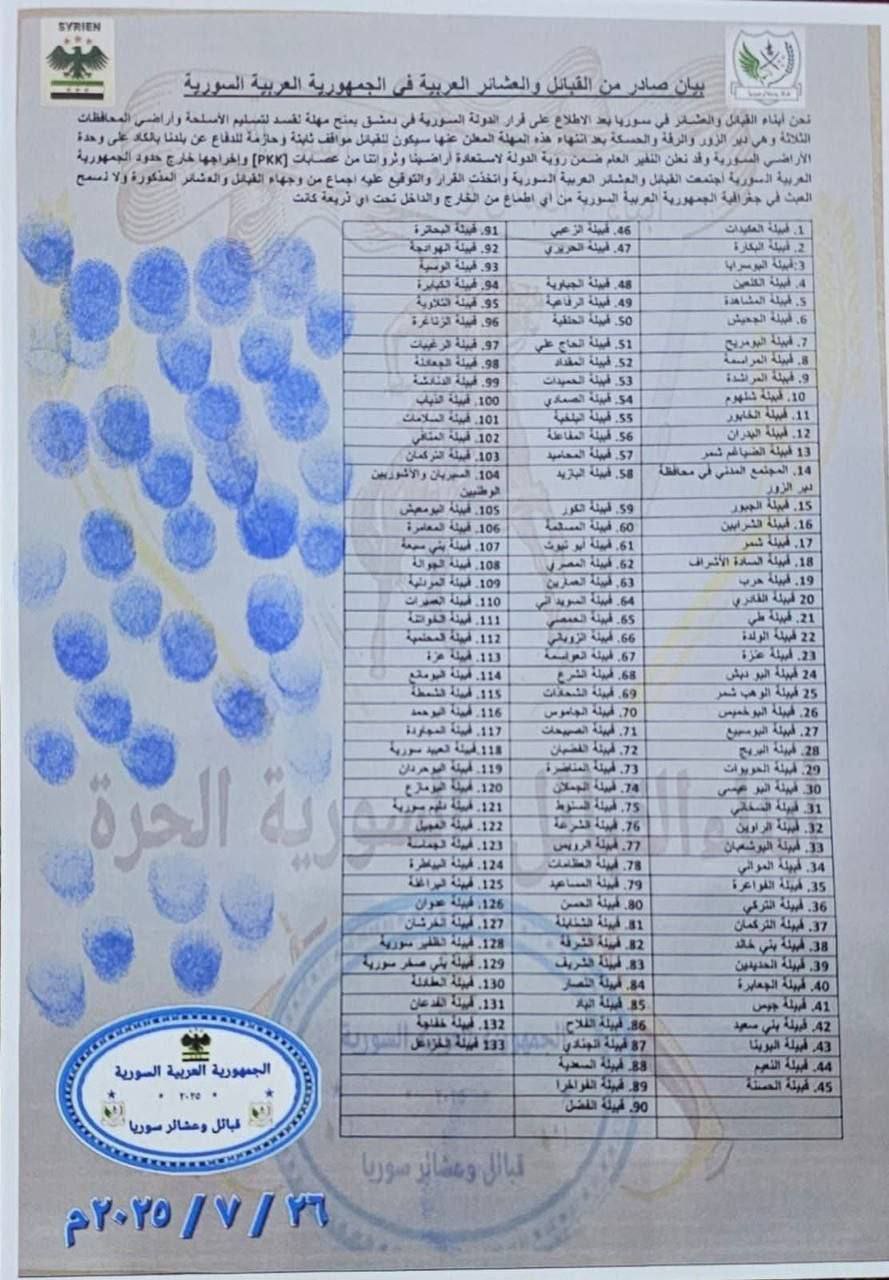 133 племени и клана на севере Сирии выпустили заявление с предупреждением, что они приступят к военной мобилизации, если «поддерживаемые Америкой» Силы демократической Сирии (СДС) ныне состоящие преимущественно из курдского ополчения и примкнувшим к ним солдатам Сирийской Арабской армии (Асада) не примут соглашение об интеграции с сирийским правительством.