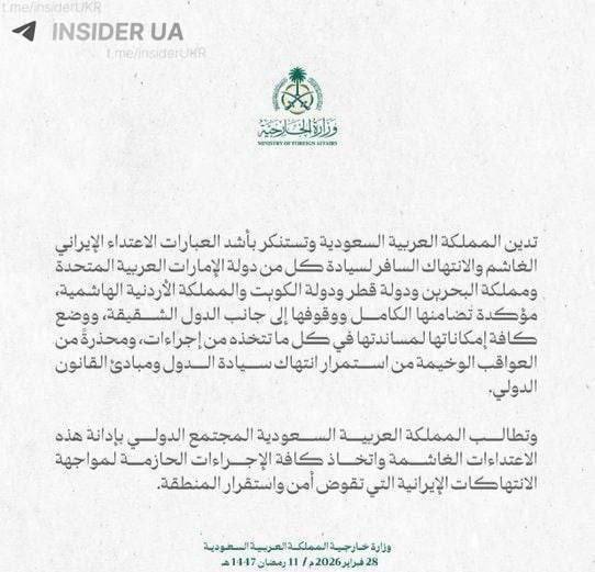 «Саудовская Аравия решительно осуждает нарушение Ираном суверенитета Бахрейна, Иордании, Катара и Кувейта и объявляет о своей солидарности с этими странами», — говорится в пресс-релизе саудовского внешнеполитического ведомства. В Эр-Рияде также призвали мировое сообщество «принять необходимые меры в отношении Ирана», поскольку его действия «угрожают стабильности и безопасности всего региона».