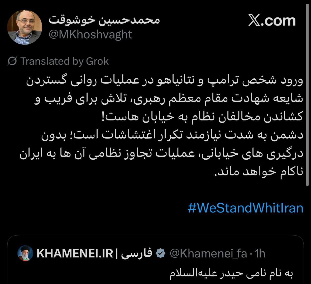 «Мы заставим сионистских преступников и бесстыжих американцев пожалеть о своих действиях. Храбрые солдаты и великая нация Ирана преподадут незабываемый урок сатанинским международным угнетателям»