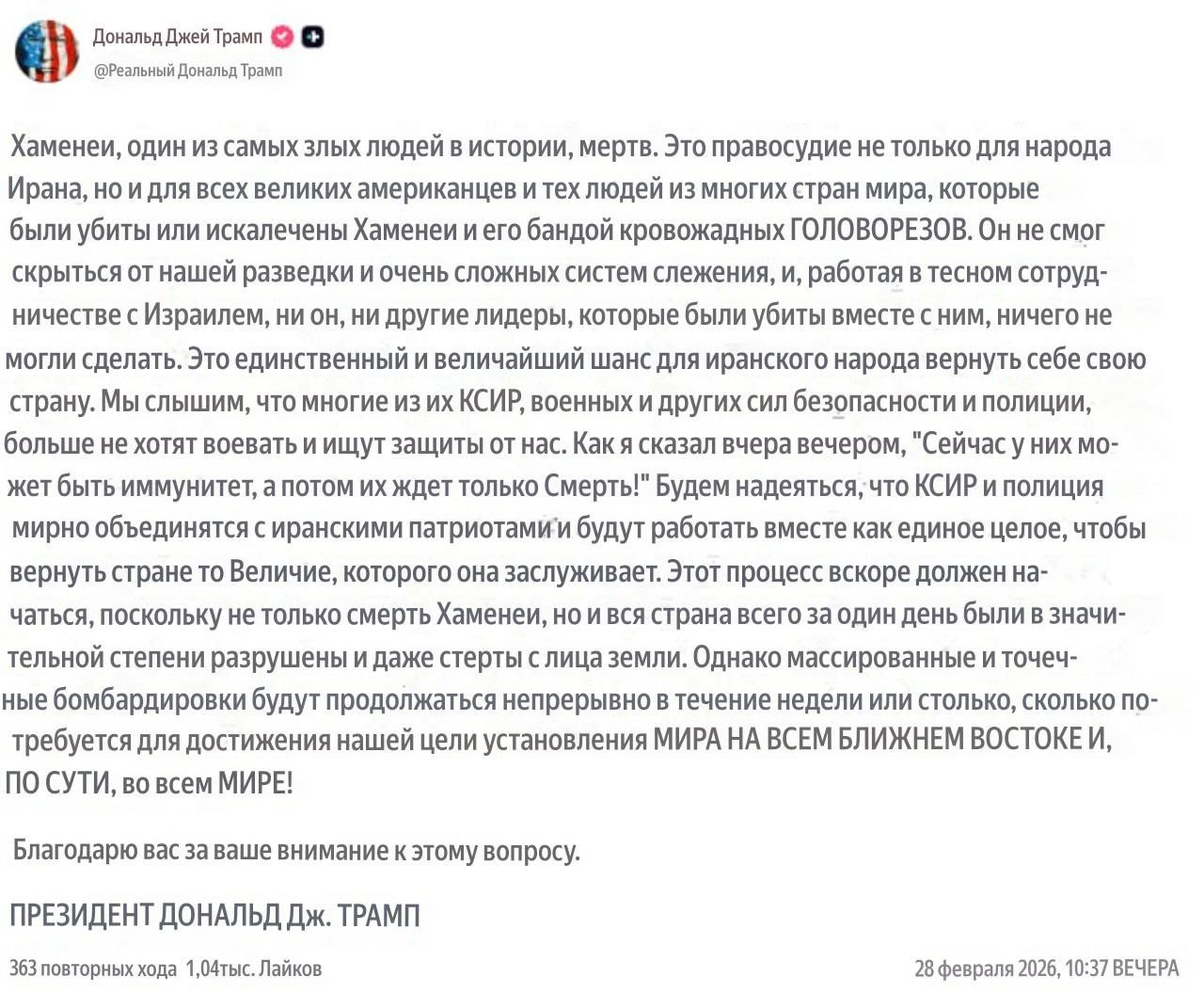 - Трамп, обращаясь к иранцам заявил, что операция США против Ирана — шанс, который выпадает раз в несколько поколений.