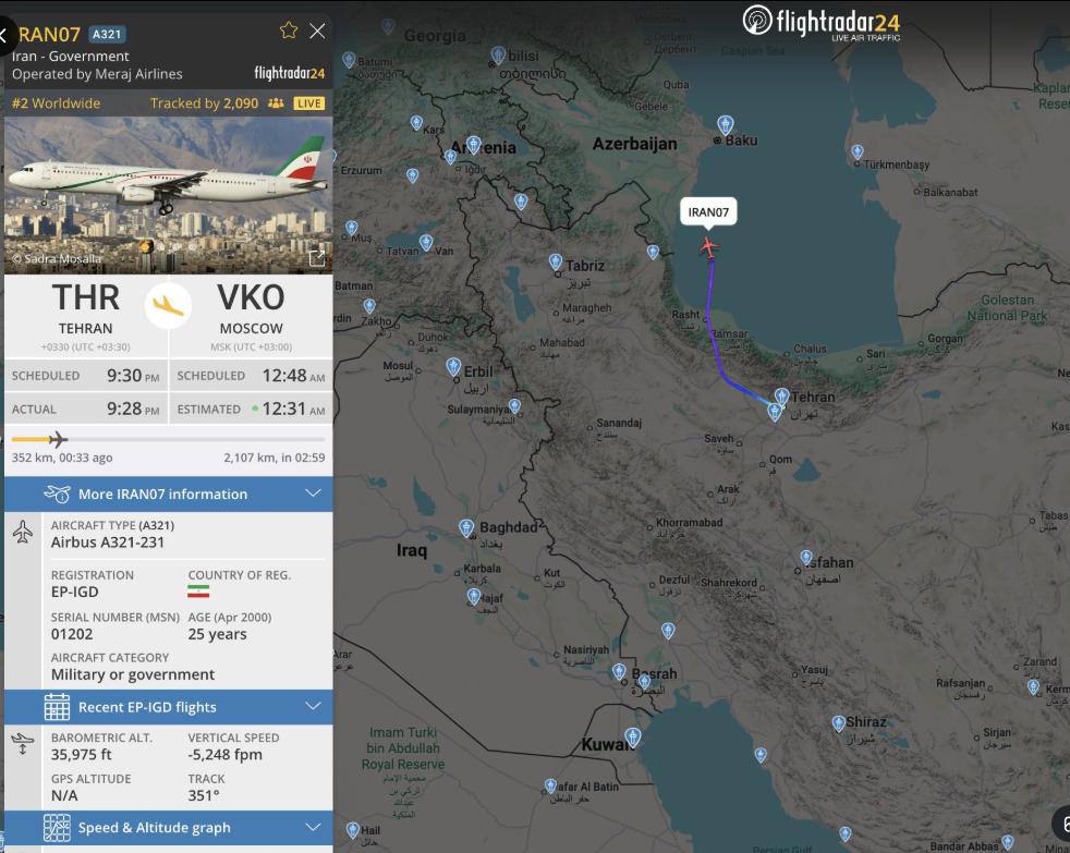 Иранский правительственный Airbus А321-231 вылетел из Тегерана в Москву.