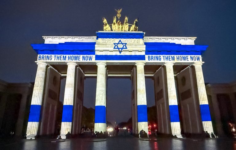С 19:00 (20:00 мск) 7 октября на Бранденбургские ворота проецируется бело-синий израильский флаг с синей звездой Давида. На воротах также можно прочитать слова «Верните их домой сейчас». Они посвящены заложникам, которые уже два года находятся в руках ХАМАС.