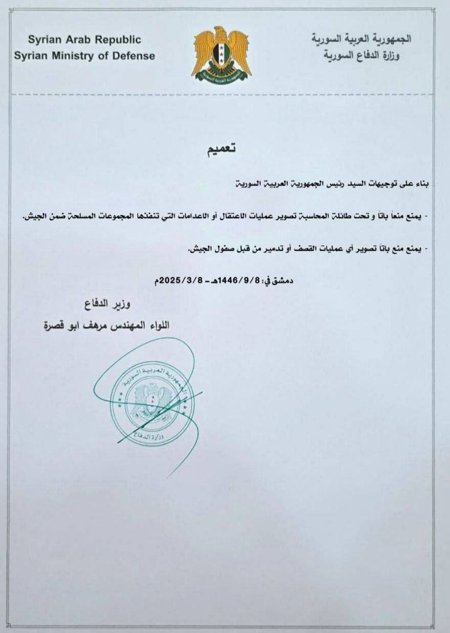 Аль-Арабия: «президент» Сирии Ахмед аш-Шараа в своей речи о последних событиях заявил: «Сирия сталкивается с опасностью остатков прежнего режима», и добавил: «Мы объявляем о формировании высшего комитета по гражданскому миру», и продолжил: «У остатков нет иного выбора, кроме как немедленно сдаться», и продолжил: «Сирия не будет втянута в гражданскую войну», и указал, что «мы не позволим никаким внешним силам втянуть Сирию в гражданскую войну», и подчеркнул необходимость привлечения к ответственности всех, кто причастен к крови мирных жителей.