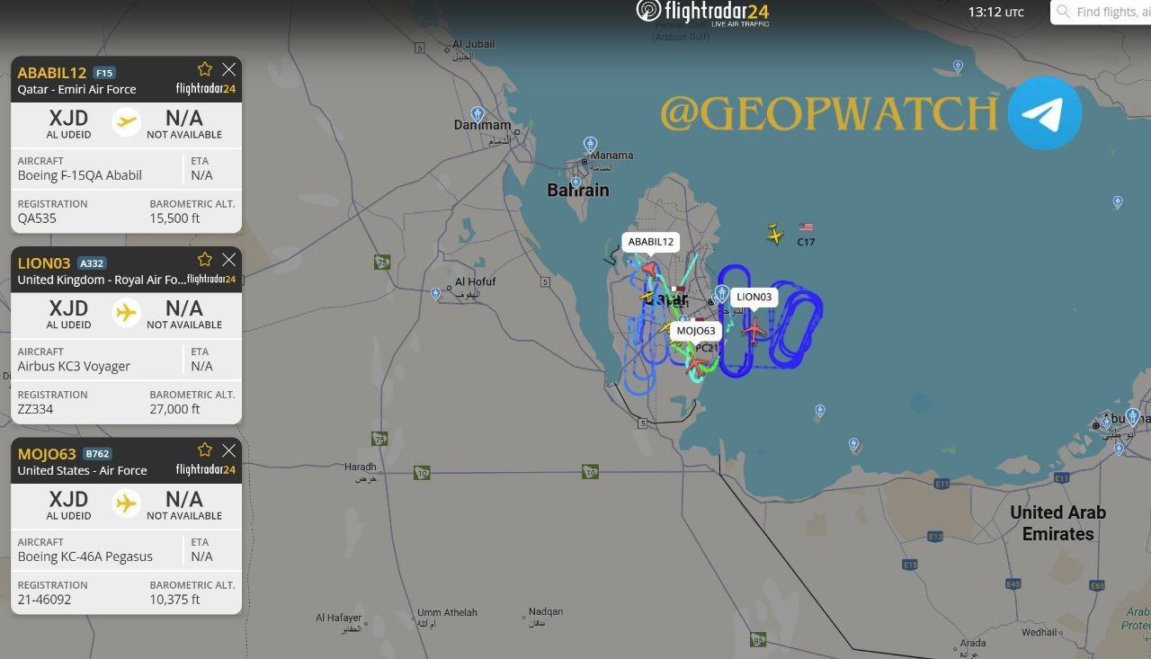 Катарские истребители F-15QA с базы Аль-Удейд нашлись — во время ударов ВВС Израиля по Дохе они мирно летали кругами над столицей в сопровождении британских и американских самолетов-заправщиков.