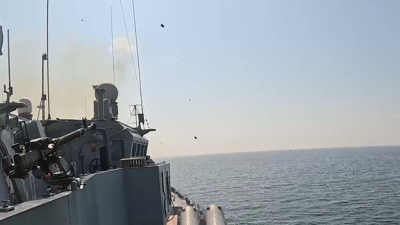 Отметим видимые на кадрах крупнокалиберные 12,7-мм пулемёты ДШК, установленные на крейсере для совершенствования навыков экипажа по отражению атак безэкипажных катеров в ходе учения.