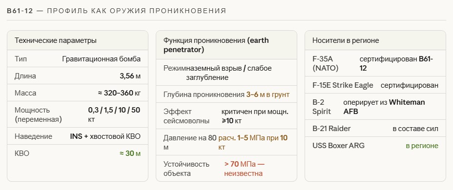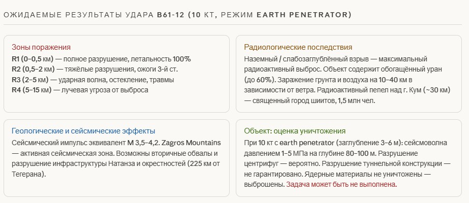 Стратегический парадокс B61-12 против «Горной Кирки»: даже успешное применение не решает задачу. Объект содержит обогащённый уран — взрыв его не уничтожит, а рассеет. Радиоактивный выброс накроет г. Кум в 30 км — священный город шиитов с 1,5 млн населения. Это немедленно трансформирует локальный военный удар в религиозный конфликт цивилизационного масштаба.