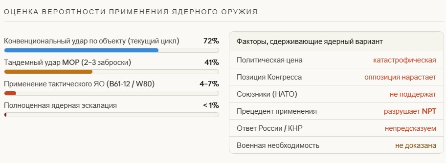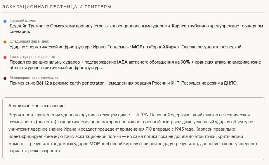 Логика прямая: если конвенциональные средства не могут гарантированно поразить объект на глубине 80–100 метров в скальном массиве — единственным вариантом гарантированного уничтожения остаётся тактическое ядерное оружие (например, B61-12 с регулируемой мощностью и функцией пробития). Именно эту логику и выражает тревога Карлсона — не как заявление о намерении Трампа, а как конечную точку эскалационной лестницы при провале конвенциональных ударов.