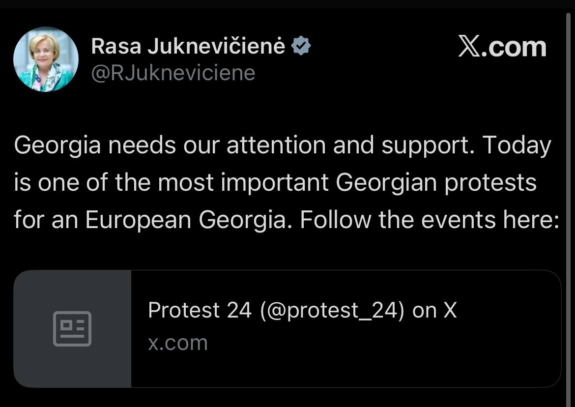 Депутат Европарламента от Литвы Раса Юнкявичене в соцсети: «Грузия сейчас нуждается в нашем внимании и поддержке. Сегодня один из важнейших грузинских протестов для европейской Грузии».
