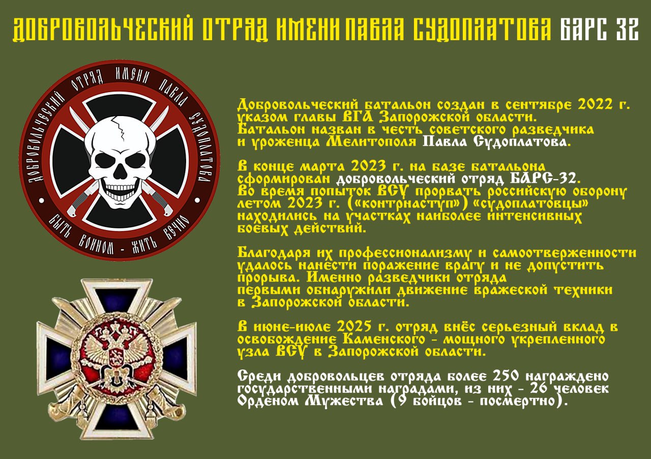 И самое, наверное, важное. Отряд «БАРС-32» известен тем, что в 2023 году разведчики «БАРС-32» первыми обнаружили так называемый контрнаступ ВСУ. И первые бои в 2023-м году приняли наши ребята. К сожалению, тогда многие погибли. АВ этом году «БАРС-32» внес решительный вклад в общее наступление ВС РФ и освободили Каменское. А Каменское – это главный укрепузел ВСУ в Запорожской области. Это была точка, которую, к сожалению, российская армия не могла освободить на протяжении очень долгого времени. И вот как раз эти бойцы, которых фотографировали до начала кампании по освобождению Каменского, принимали участие в его освобождении. Все, к счастью, живые, никто не получил ранения».