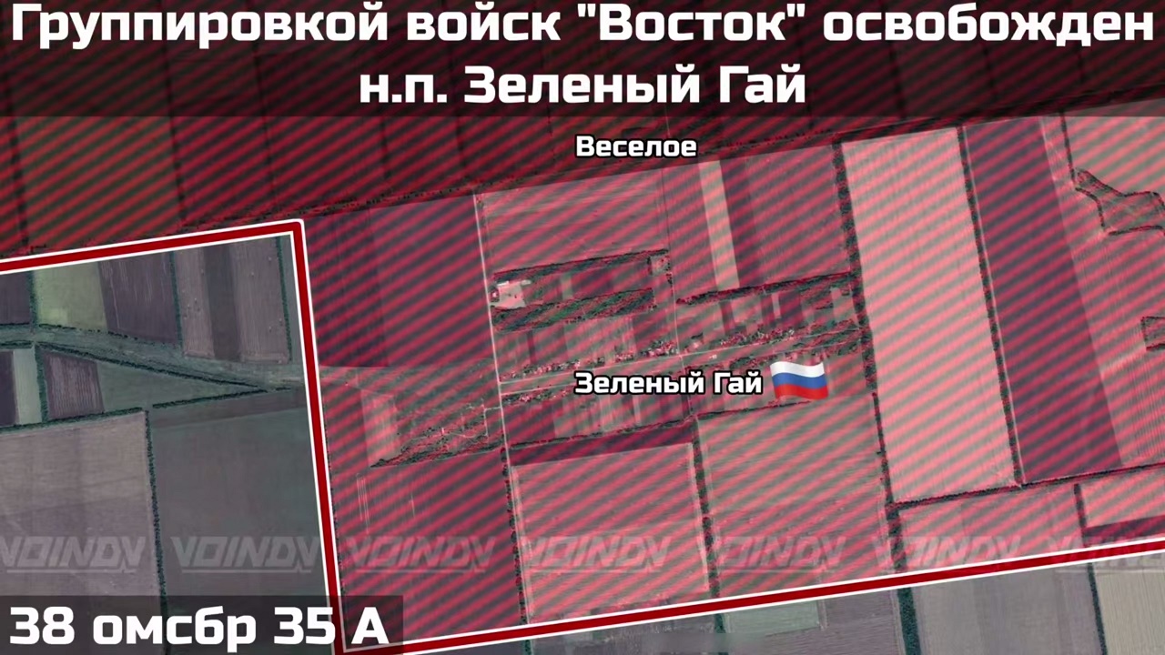 Вооруженные силы России, продолжая свое наступление в Запорожской области, освободили населенный пункт Зеленый Гай. Заняли село штурмовики 38-й гвардейской мотострелковой бригады 35-й армии группировки войск «Восток».