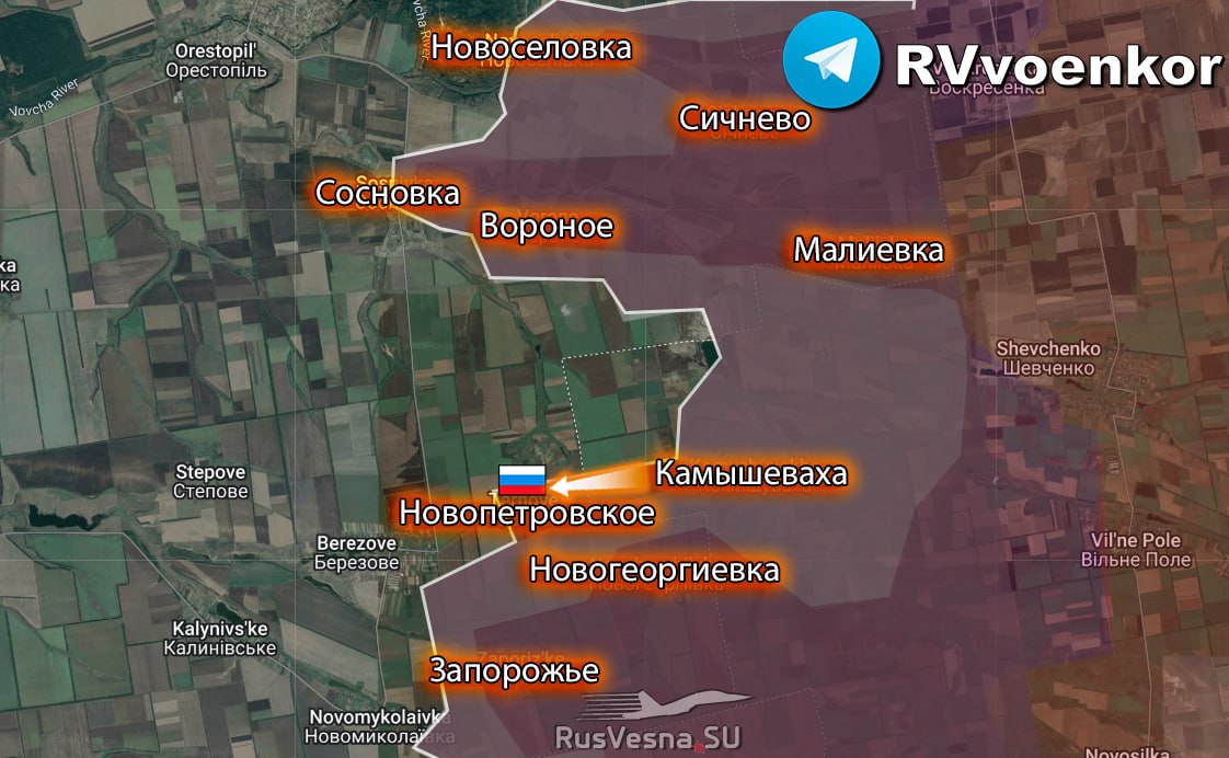 Части ВС РФ решительным наступлением и активными действиями подразделений группировки войск «Восток» смогли установить контроль над населённым пунктом Новопетровское (Терновое). Теперь посёлок полностью освобождён.