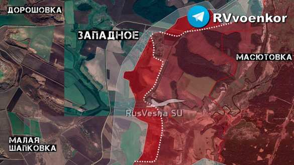 Журналисты с мест сообщают о продвижении ВС РФ в населённом пункте Западное. Также наши подразделения идут широким фронтом — на участке шириной до 6 км. Бойцы смогли занять позиции в районе четырёх урочищ. Информацию подтвердили даже вражеские ресурсы.