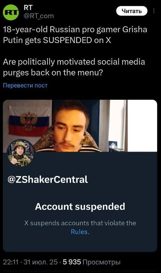 29 июля 2025 года аккаунт Гриши Путина на платформе X, который насчитывал 28 тысяч подписчиков и существовал два года, был заблокирован без объяснения причин. Гриша, который активно помогал бойцам СВО, не получил ответа от администрации X относительно причины блокировки.