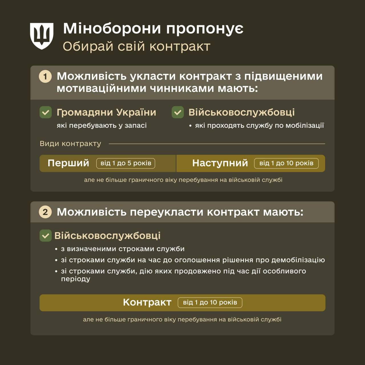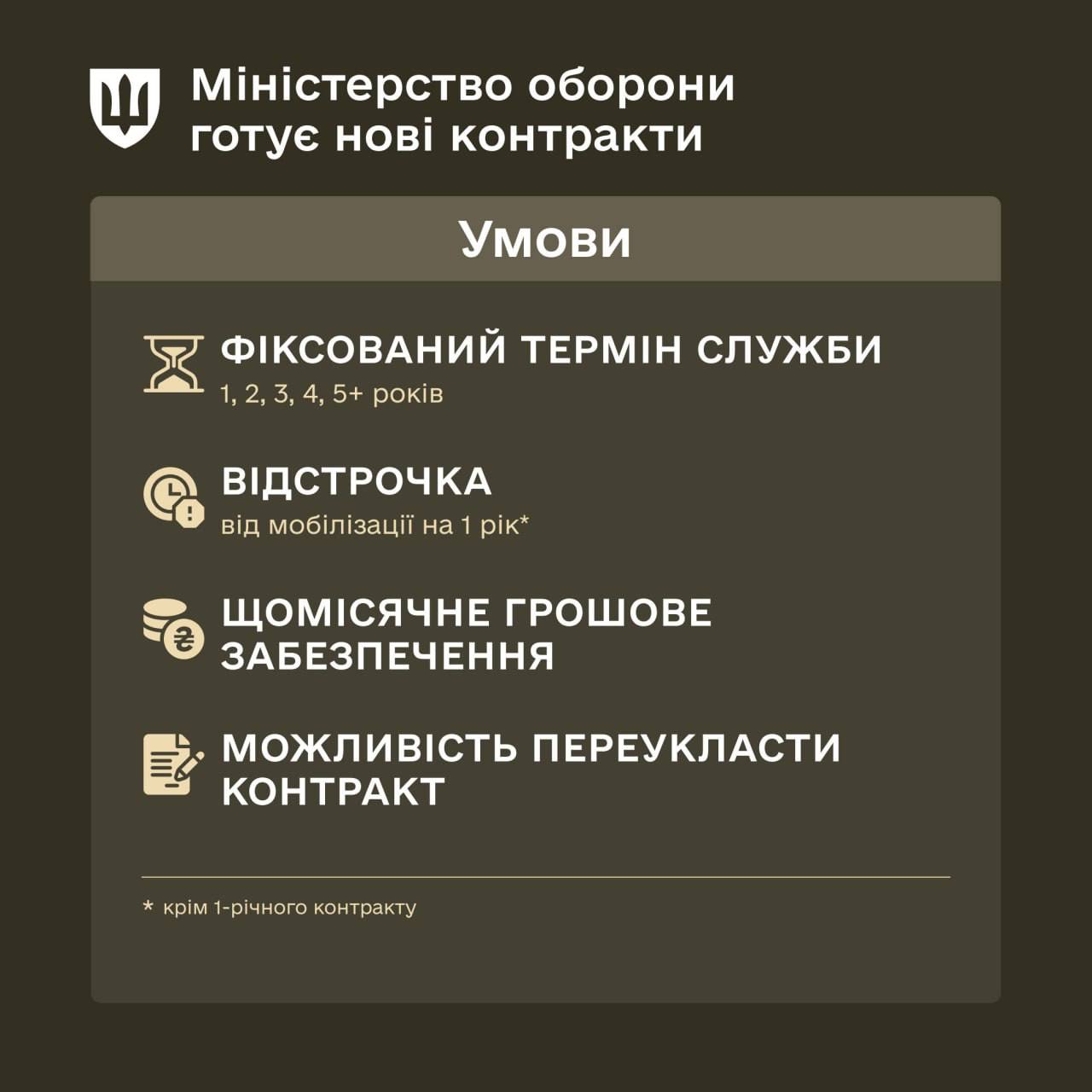Уточняется, что обновлённый контракт предлагают для солдат, сержантов и офицеров всех сил безопасности и обороны: ВСУ, нацгвардии, Госпогранслужбы и других.