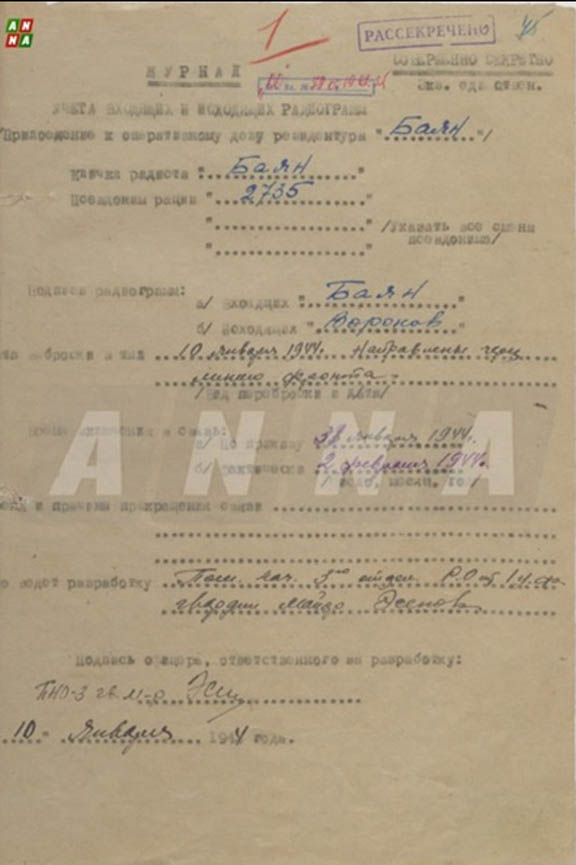 Данная статья представляет собой журнал учёта входящих и исходящих радиограмм, являющийся приложением к оперативному делу резидентуры с кличкой радиста «Баян», псевдоним рации 2735. Время включения в связь: по приказу – 31 января 1944 г., фактически – 2 февраля 1944 г. Разработку вел помощник начальника 3-го отдела РОШБ 1 У.Ф, гвардии майор Эсенов.