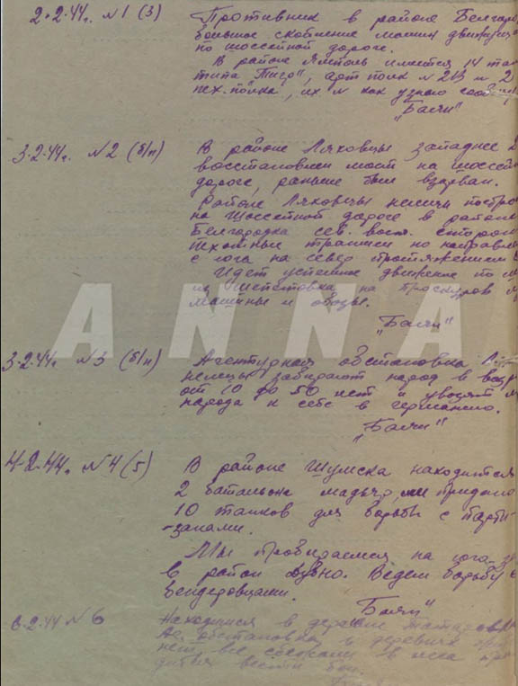 2 февраля 1944 г. согласно сообщению «Баяна» в районе Белгородка отмечается большое скопление машин, которые движутся по шоссейной дороге. В районе Ямполя сосредоточено 14 танков типа «Тигр», арт. полк № 213 и 2 технических полка.