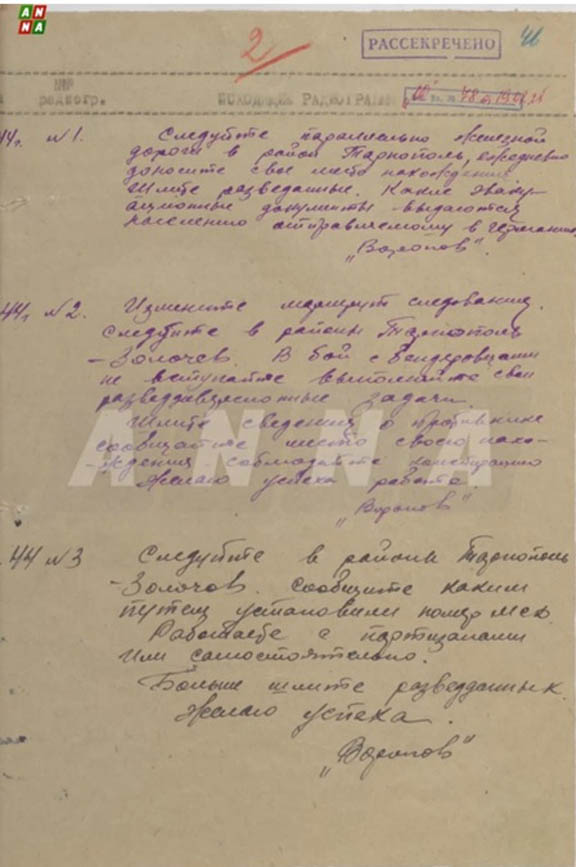Параллельно с этими сообщениями приходят инструкции от «Воранова» по проведению разведывательных операций. Согласно первой инструкции, нужно было следовать параллельно железной дороге в район Тернополь и ежедневно сообщать о местонахождении или разведданных. В документе указана и просьба описать документы, выдаваемые населению, эвакуируемому в Германию.