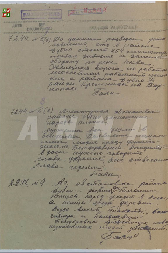 7 февраля 1944 г. «Баян» информирует о наличии в районе Дубно 254 мотострелковой дивизии, которая держит оборону по реке Иква. Отмечается, что железная дорога не функционирует, зато шоссейная дорога активно используется для передвижения войск от Дубно к Кремницу и Тернополь. Агентурная обстановка в районе Дубно крайне напряженная: мужчины ушли в ряды бандеровцев, а незнакомцев сразу уничтожают. Радист сообщает, что при встрече с бандеровцами принято приветствовать их словами «слава Украине», в ответ следует говорить— «слава героям».